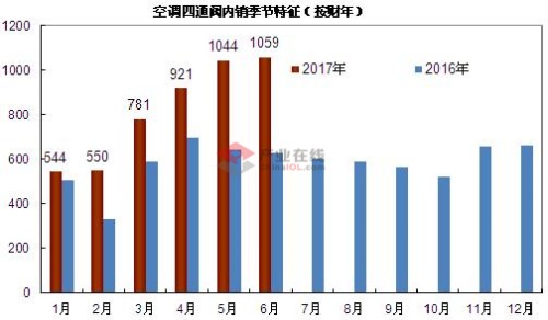 根据产业在线监测数据显示,2017年6月,空调四通阀内销1059万只,环比增长1.4%,同比上涨69.2%;财年内销量为4899万只,同比上涨44.5%;冷年累计内销量为7892万只,同比上涨43.1%。